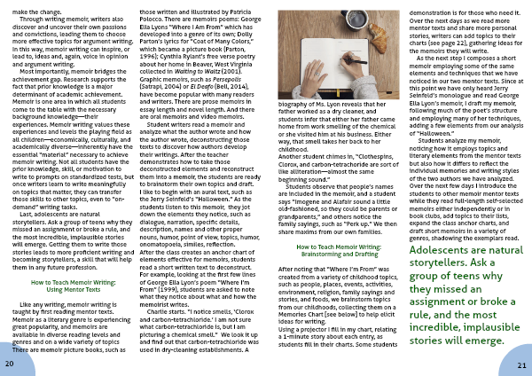 Through writing memoir, writers also discover and uncover their own passions and convictions, leading them to choose more effective topics for argument writing. In this way, memoir writing can inspire, or lead to, ideas and, again, voice in opinion and argument writing.