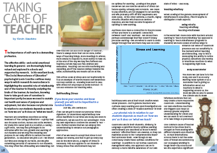 This article looks at stress and our relationship to it as an example of how increased self-awareness can help sustain us. Knowing how best to deal with stress not only helps us avoid burnout – it can also enhance our teaching skills.