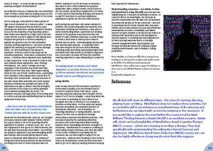 How can we develop this increased capacity to notice what is going on in the moment and to choose to respond rather than react? Some teachers may just naturally have this gift, but for many of us it can be struggle – especially when we are so used to spending so much time in our thoughts and rely so heavily on our analytical problem-solving skills. For me, what has helped has been the gentle and repeated practice of training the attention. The foundation of ‘Teaching Mindfully’ is ‘Being Mindful’, and for many of us this can be enhanced through developing a personal mindfulness practice. This increased capacity for sustaining attention becomes even more important when turning towards more challenging emotions, thoughts or situations. Mindfulness is in essence a training in developing relaxed alertness, and once we begin to feel some confidence in growing this for ourselves, we can then begin to apply it in our classrooms – without ever needing to turn it into a lesson on mindfulness. Some teachers may then want to go on to explore helping students develop this capacity for themselves.