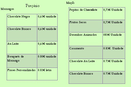 Maçãs Pepitas de Chocolate 0,75€ Unidade Frutos Secos 0,75€ Unidade Desenhos Animados 085€ Unidade Casamento 0.85€ Unidade Chocolate Au Leite 0.75€ Unidade Chocolate Branco 0.75€ Unidade