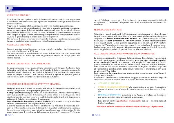 Dirigente scolastico : elabora e comunica al Collegio dei Docenti l ’ atto di indirizzo , al quale il Collegio deve rifarsi per la predisposizione del PTOF . Collegio dei Docenti : sceglie l ’ attività didattica il Piano dell ’ Offerta Formativa ( PTOF ), individua gli obiettivi generali della scuola , definisce e integra il curricolo generale della scuola nei suoi tre indirizzi , approva la validità didattica delle singole attività proposte e dei progetti . Definisce anche i criteri di valutazione . Dipartimenti delle Discipline e Consigli di classe : organizzano la programmazione didattica sulla base delle finalità generali della scuola . L ’ attività didattica ha una connotazione orientativa ed è finalizzata a consolidare , integrare e sviluppare : le competenze di base relative ai quattro assi fondamentali : asse dei linguaggi ; asse matematico ; asse scientifico-tecnologico ; asse storico-sociale le otto competenze-chiave di cittadinanza : 1 ) Imparare ad imparare ; 2 ) progettare ; 3 ) Comuni-