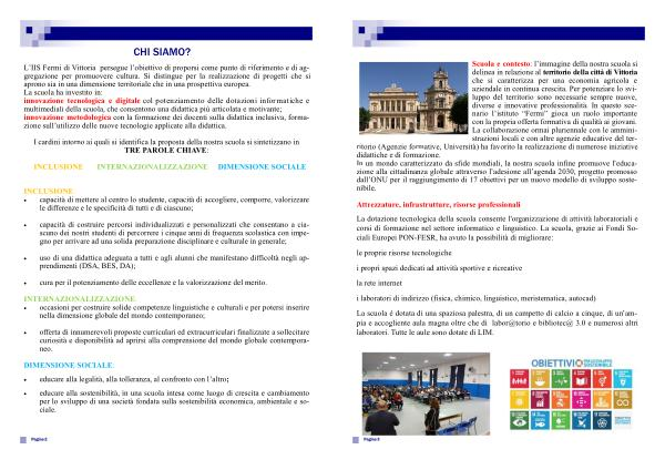 Scuola e contesto : l ’ immagine della nostra scuola si delinea in relazione al territorio della città di Vittoria che si caratterizza per una economia agricola e aziendale in continua crescita . Per potenziare lo sviluppo del territorio sono necessarie sempre nuove , diverse e innovative professionalità . In questo scenario l ’ istituto “ Fermi ” gioca un ruolo importante con la propria offerta formativa di qualità ai giovani . La collaborazione ormai pluriennale con le amministrazioni locali e con altre agenzie educative del territorio ( Agenzie formative , Università ) ha favorito la realizzazione di numerose iniziative didattiche e di formazione . In un mondo caratterizzato da sfide mondiali , la nostra scuola infine promuove l ’ educazione alla cittadinanza globale attraverso l ’ adesione all ’ agenda 2030 , progetto promosso dall ’ ONU per il raggiungimento di 17 obiettivi per un nuovo modello di sviluppo sostenibile .