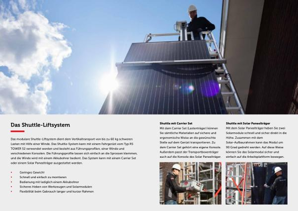 Shuttle mit Solar Paneelträger Mit dem Solar Paneelträger heben Sie zwei Solarmodule schnell und sicher direkt in die Höhe . Zusammen mit dem Solar-Aufbaurahmen kann das Modul um 90 Grad gedreht werden . Auf diese Weise können Sie das Solarmodul sicher und einfach auf die Arbeitsplattform bewegen .