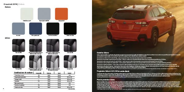 Subaru conçoit et construit tous ses véhicules afin qu’ ils offrent aux clients les plus hauts standards de qualité et de fiabilité. Nous sommes fiers de nos véhicules et nous nous faisons un point d’ honneur de répondre de nos produits avec une garantie des plus complètes. Pour les modèles de l’ année 2018, la garantie de tous les véhicules Subaru consiste en ce qui suit: