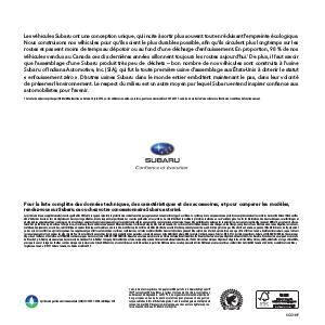 Le système de retenue supplémentaire( coussins gonflables SRS) a été conçu pour ajouter à la protection du conducteur et du passager avant advenant certains types de collision. Ce système procure uniquement une protection complémentaire et les ceintures de sécurité doivent être bouclées afin d’ éviter des blessures lors du déploiement des coussins gonflables, à tout occupant mal positionné. Les coussins gonflables et les ceintures de sécurité offrent la meilleure protection combinée en cas d’ accident grave. Toutes les illustrations, données techniques, caractéristiques et photographies apparaissant dans ce document sont conformes aux plus récents renseignements sur les produits disponibles au moment de son impression et pourraient ne pas être parfaitement exactes après sa publication. Les couleurs représentées peuvent différer des couleurs réelles en raison des procédés de reproduction et d’ impression, et certaines pièces du véhicule ne peuvent être montrées dans certaines photographies. Subaru Canada, Inc. se réserve le droit d’ abandonner ou de changer, en tout temps, sans préavis et sans être tenue à aucune obligation, les couleurs, matériaux, équipements, accessoires, caractéristiques, données techniques et modèles ou encore d’ en modifier le prix. Certains modèles illustrés dans cette brochure peuvent provenir de marchés étrangers et ne pas être offerts au Canada, ou peuvent être illustrés avec de l’ équipement ou des accessoires offerts en option( moyennant un supplément), ou offerts seulement dans certaines combinaisons. Certains modèles illustrés dans cette brochure peuvent être sujets à des retards de production ou ne pas être offerts au Canada. Veuillez visiter subaru. ca pour obtenir les renseignements et les données les plus récents. Pour tous les détails au sujet des révisions de produits et des garanties, communiquez avec votre détaillant Subaru. BRZ, Impreza, Outback, Legacy, Forester, WRX, STI, Crosstrek, Lineartronic, Subaru et SUBARU BOXER sont des marques déposées. « Confiance et évolution » et STARLINK sont des marques de commerce de SUBARU CORPORATION. Aha est une marque de commerce de Harman International Industries, Inc. Bluetooth est une marque déposée de Bluetooth SIG, Inc. America. Brembo est une marque de commerce de Brembo S. p. A. Dunlop est une marque de commerce de Goodyear Tire & Rubber Company. Harman Kardon est une marque déposée de Harman International Industries, Inc. iPod et Siri sont des marques déposées de Apple Inc. « Sirius XM », « Sirius », « XM », « NavTraffic », le logo « SiriusXM », ainsi que le nom et le logo des chaînes sont des marques de commerce de Sirius XM Radio Inc. et sont utilisées en vertu d’ une licence par Sirius XM Canada Inc. Les abonnements à Sirius XM Canada sont assujettis au contrat client de SiriusXM Canada et à d’ autres modalités et conditions. Imprimé au Canada. © 2017 Subaru Canada, Inc. Année modèle 2018.