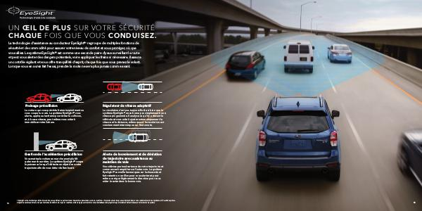 1 EyeSight est une technologie d’aide à la conduite, susceptible de ne pas fonctionner de manière optimale dans certaines conditions. Il incombe en tout temps au conducteur d’adopter une conduite sécuritaire et prudente. L’efficacité du système