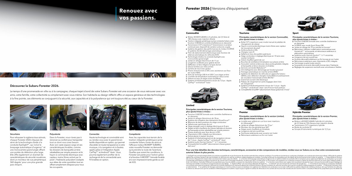 Pour rehausser la vigilance tous azimuts, chaque Forester 2026 s’ équipe de série de la technologie d’ aide à la conduite EyeSight ® 1, qui inclut le braquage automatique d’ urgence 2, 3 et une monocaméra grand angle offrant une portée de détection plus large. Elle offre également un éventail de caractéristiques de sécurité novatrices, dont un moniteur de vue périphérique 360 degrés 2 pour une plus grande paix d’ esprit.