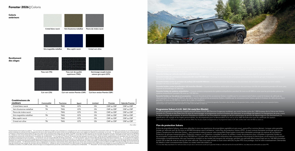 fonctionnement et les limites du système. 10 Les fonctions de détection d’ angles morts, d’ assistance au changement de voie et d’ avertissement de circulation transversale arrière sont des aides à la conduite qui surveillent les zones arrière et latérales du véhicule lors des changements de voie ou des manœuvres de marche arrière et ne remplacent en aucun cas la vigilance et l’ attention du conducteur sur la route. 11 Nécessite l’ activation avec un abonnement. Comprend un abonnement d’ essai gratuit de trois mois. Voyez votre concessionnaire Subaru pour les détails. SiriusXM MD et le logo SiriusXM, ainsi que le nom et le logo des chaînes sont des marques de commerce de Sirius XM Radio Inc., utilisées en vertu d’ une licence par Sirius XM Canada Inc. Les abonnements à Sirius XM Canada sont assujettis au contrat client de Sirius XM Canada et à d’ autres modalités et conditions. SiriusXM recueille, utilise et divulgue vos renseignements personnels conformément à sa politique de confidentialité. 12 Les jantes de 19 pouces ne peuvent pas être équipées de pneus d’ hiver. L’ achat de jantes supplémentaires est nécessaire pour les pneus d’ hiver. Consultez le concessionnaire pour les détails. 13 HomeLink MD est une marque déposée de Gentex Corporation. 14 Harman Kardon MD est une marque déposée de Harman International Industries, Inc. 15 Le système de mitigation des distractions DriverFocus est une technologie de reconnaissance du conducteur conçue pour alerter le conducteur si son attention se relâche ou si son visage semble se détourner de la route. Il incombe en tout temps au conducteur d’ adopter une conduite sécuritaire et prudente. L’ efficacité du système pourrait être compromise par le port d’ accessoires vestimentaires sur la tête ou le visage. Consultez le Manuel du propriétaire pour les détails de fonctionnement et les limites du système. 16 Nécessite l’ activation avec un abonnement. Comprend un abonnement d’ essai gratuit de trois ans. Voyez votre concessionnaire Subaru pour les détails. SiriusXM MD et le logo SiriusXM, ainsi que le nom et le logo des chaînes sont des marques de commerce de Sirius XM Radio Inc., utilisées en vertu d’ une licence par Sirius XM Canada Inc. Les abonnements à Sirius XM Canada sont assujettis au contrat client de Sirius XM Canada et à d’ autres modalités et conditions. SiriusXM recueille, utilise et divulgue vos renseignements personnels conformément à sa politique de confidentialité. 17 Ultrasuede MD est une marque déposée de Toray Industries, Inc.