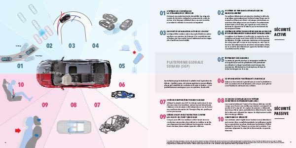 1 Le système de freinage automatique en marche arrière ne peut se substituer à la vigilance et à l’ attention du conducteur sur la route. L’ efficacité du système dépend de nombreux facteurs, tels que l’ entretien du véhicule, la vitesse, ainsi que les conditions météorologiques et routières. Soyez toujours vigilant et utilisez les rétroviseurs et la caméra de recul lors des manœuvres de marche arrière. Consultez le Manuel du propriétaire pour les détails de fonctionnement et les limites du système. Nécessite l’ ensemble EyeSight ® en option. 2 Modèles Sport-tech seulement. 3 Modèles Sport et Sport-tech seulement. 4 SRS: Système de retenue supplémentaire. Efficace lorsqu’ utilisé avec les ceintures.