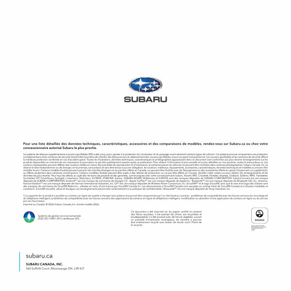 Imprimé au Canada. © 2026 Subaru Canada, Inc. Année modèle 2026.