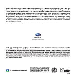 Le système de retenue supplémentaire( coussins gonflables SRS) a été conçu pour ajouter à la protection du conducteur et du passager avant advenant certains types de collision. Ce système procure uniquement une protection complémentaire et les ceintures de sécurité doivent être bouclées afin d’ éviter des blessures lors du déploiement des coussins gonflables, à tout occupant mal positionné. Les coussins gonflables et les ceintures de sécurité offrent la meilleure protection combinée en cas d’ accident grave. Toutes les illustrations, données techniques, caractéristiques et photographies apparaissant dans ce document sont conformes aux plus récents renseignements sur les produits disponibles au moment de son impression et pourraient ne pas être parfaitement exactes après sa publication. Les couleurs représentées peuvent différer des couleurs réelles en raison des procédés de reproduction et d’ impression, et certaines pièces du véhicule ne peuvent être montrées dans certaines photographies. Subaru Canada, Inc. se réserve le droit d’ abandonner ou de changer, en tout temps, sans préavis et sans être tenue à aucune obligation, les couleurs, matériaux, équipements, accessoires, caractéristiques, données techniques et modèles ou encore d’ en modifier le prix. Certains modèles illustrés dans cette brochure peuvent provenir de marchés étrangers et ne pas être offerts au Canada, ou peuvent être illustrés avec de l’ équipement ou des accessoires offerts en option( moyennant un supplément), ou offerts seulement dans certaines combinaisons. Certains modèles illustrés dans cette brochure peuvent être sujets à des retards de production ou ne pas être offerts au Canada. Veuillez visiter subaru. ca pour obtenir les renseignements et les données les plus récents. Pour tous les détails au sujet des révisions de produits et des garanties, communiquez avec votre détaillant Subaru. Ascent, BRZ, Impreza, Outback, Legacy, Forester, WRX, STI, Crosstrek, Lineartronic, Subaru et SUBARU BOXER sont des marques déposées. « Confiance et évolution » et STARLINK sont des marques de commerce de SUBARU CORPORATION. Aha est une marque de commerce de HARMAN International Industries, Inc. Bluetooth est une marque déposée de Bluetooth SIG, Inc. America. Brembo est une marque déposée de Brembo S. p. A. Dunlop est une marque déposée de Goodyear Tire & Rubber Company. Harman Kardon est une marque déposée de Harman International Industries, Inc. iPod et Siri sont des marques déposées de Apple Inc. « Sirius XM », « Sirius », « XM », « NavTraffic », le logo « SiriusXM » ainsi que le nom et le logo des chaînes sont des marques de commerce de Sirius XM Radio Inc. et sont utilisées en vertu d’ une licence par Sirius XM Canada Inc. Les abonnements à SiriusXM Canada sont assujettis au contrat client de SiriusXM Canada et à d’ autres modalités et conditions. Imprimé au Canada. © 2018 Subaru Canada, Inc. Année modèle 2019.