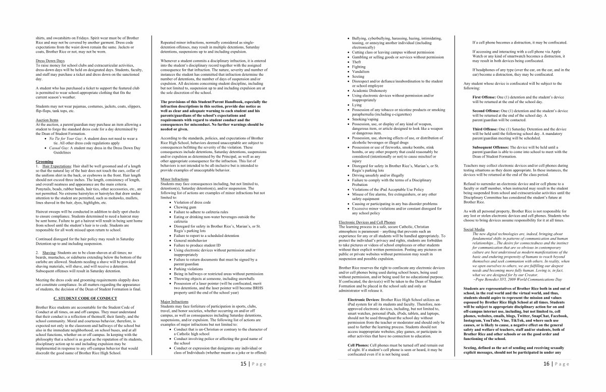 According to the standards, policies, and expectations of Brother Rice High School, behaviors deemed unacceptable are subject to consequences befitting the severity of the violation. These consequences include detentions, Saturday detentions, suspensions and / or expulsion as determined by the Principal, as well as any other appropriate consequence for the infraction. This list of behaviors is not intended to be all-inclusive but is intended to provide examples of unacceptable behavior.