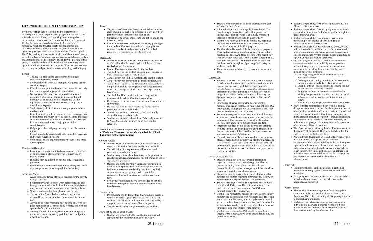 • Brother Rice reserves the right to remove any game apps from a school iPad that is considered inappropriate or impedes the educational purpose of the Apple iPad program, as determined by the administration.