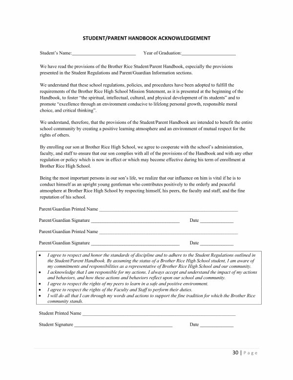 By enrolling our son at Brother Rice High School, we agree to cooperate with the school’ s administration, faculty, and staff to ensure that our son complies with all of the provisions of the Handbook and with any other regulation or policy which is now in effect or which may become effective during his term of enrollment at Brother Rice High School.