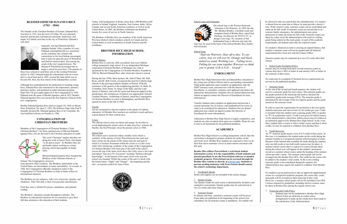 In order to meet the requirements for promotion to the next grade, students must pass and earn at least six( 6) credits per year. Credit is awarded when the student earns a passing grade( 60 % or greater or“ P”) in a particular course. Credit is not given for failed courses. At the administration’ s discretion, failed courses may be retaken at an institution approved by Brother Rice High School. In the event that a student fails a course or fails a retake course and thus is short credits, he may be required to withdraw from Brother Rice.