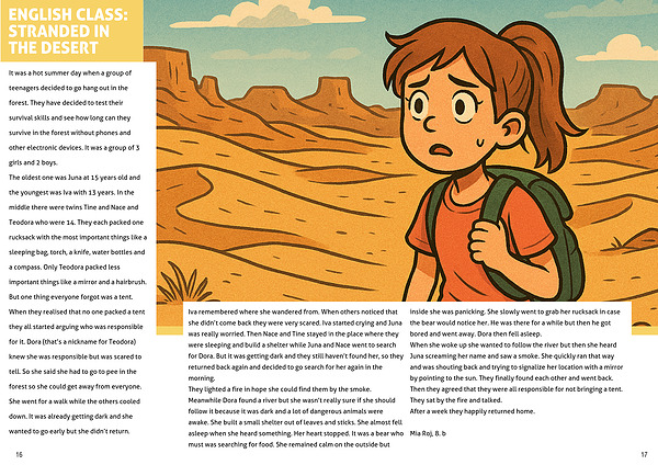 They lighted a fire in hope she could find them by the smoke. Meanwhile Dora found a river but she wasn’t really sure if she should follow it because it was dark and a lot of dangerous animals were awake. She built a small shelter out of leaves and sticks. She almost fell asleep when she heard something. Her heart stopped. It was a bear who must was searching for food. She remained calm on the outside but inside she was panicking. She slowly went to grab her rucksack in case the bear would notice her. He was there for a while but then he got bored and went away. Dora then fell asleep.