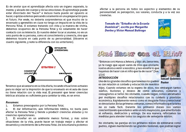 Es de anotar que el aprendizaje afecta solo un órgano separado, la mente, y aislado del cuerpo y de las emociones. El aprendizaje puede estar divorciado del "hacer" e incluso hasta puede ser opuesto al hacer, o quizás estemos pensando solamente en una preparación para el futuro. Por ende, no debería sorprendernos el que mucho de lo ensenado y aprendido en clase no tenga un impacto en la vida de la Persona Total. Si estamos tratando con vida y la manera de vivirla, debemos ocuparnos de la Persona Total y no solamente de hacer contacto con su intelecto. Es nuestro deber tocar al alumno, no en un solo punto de su persona, como el conocimiento y creencia, sino que debemos tocarle en cada punto de su personalidad. (Observe el cuadro siguiente, y note la diferencia con los anteriores).