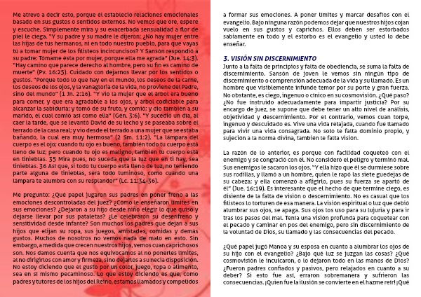 Me pregunto: ¿Qué papel jugaron sus padres en poner freno a las emociones descontroladas del juez? ¿Cómo le enseñaron límites en sus emociones? ¿Dejaron a su hijo desde niño elegir lo que quiso y dejarse llevar por sus pataletas? ¿Le celebraron su desenfreno y sensitividad desde infante? Son muchos los padres que dejan a sus hijos que elijan su ropa, sus juegos, amistades, comidas y demás gustos. Muchos de nosotros no vemos nada de malo en esto. Sin embargo, a medida que crecen nuestros hijos, vemos cuan caprichosos son. Nos damos cuenta que nos equivocamos al no ponerles límites, al no dirigirlos con amor y firmeza, sino dejarlos a su necia disposición. No estoy diciendo que el gusto por un color, juego, ropa o alimento, sea en sí mismo pecaminoso. Lo que estoy diciendo es que, como padres y tutores de los hijos del Reino, estamos llamados y compelidos a formar sus emociones. A poner límites y marcar desafíos con el evangelio. Bajo ninguna razón podemos dejar que nuestros hijos cojan vuelo en sus gustos y caprichos. Ellos deben ser estorbados sabiamente en todo y el estorbo es el evangelio y usted lo debe enseñar.