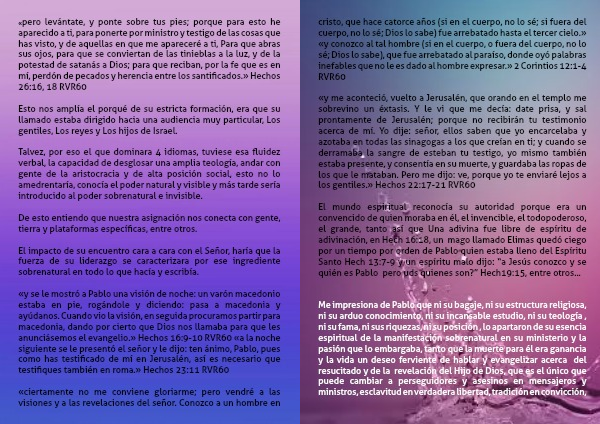 «ciertamente no me conviene gloriarme; pero vendré a las visiones y a las revelaciones del señor. Conozco a un hombre en cristo, que hace catorce años (si en el cuerpo, no lo sé; si fuera del cuerpo, no lo sé; Dios lo sabe) fue arrebatado hasta el tercer cielo.» «y conozco al tal hombre (si en el cuerpo, o fuera del cuerpo, no lo sé; Dios lo sabe), que fue arrebatado al paraíso, donde oyó palabras inefables que no le es dado al hombre expresar.» 2 Corintios 12:1-4 RVR60