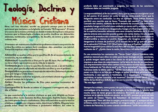 La responsabilidad, al fin de cuentas, de lo que se canta en una Iglesia Local es del pastor. Si el pastor no cuida lo que se canta puede hacer que la feligresía entre en confusión. Le doy un ejemplo. Jesús Adrian Romero escribió una canción que se llama “Cansado del camino”. La letra dice: Cansado del camino, sediento de ti/un desierto he cruzado,/sin fuerzas he quedado,/vengo a ti./Luché como soldado y a veces sufrí y aunque la lucha he ganado,/mi armadura he desgastado,/vengo a ti./Sumérgeme!! En el río de tu espíritu,/necesito refrescar este seco corazón,/sediento de ti. Si una Iglesia entona esta canción puede quedar con varias dudas. (1) ¿Se puede desgastar la armadura del cristiano? Según Efesios 6:10-20 la armadura es indestructible y menos se podría desgastar. ¿Se imagina usted que se desgastara la coraza de justicia? ¿O El escudo de la fe? ¿y qué del yelmo de la salvación? (2) Juan 7:37-39 el Señor dice que el Espíritu Santo es una fuente inagotable para calmar la sed. Pero JAR nos dice “este seco corazón,/ sediento de ti”. ¿Quién tiene la razón, Jesucristo o el señor Romero?