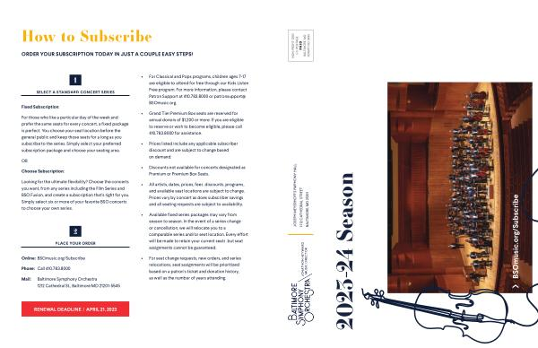 Online : BSOmusic . Online org / Subscribe : BSOmusic . org / Subscribe Phone : Call 410.783.8000 Phone : Call 410.783.8000 Mail :