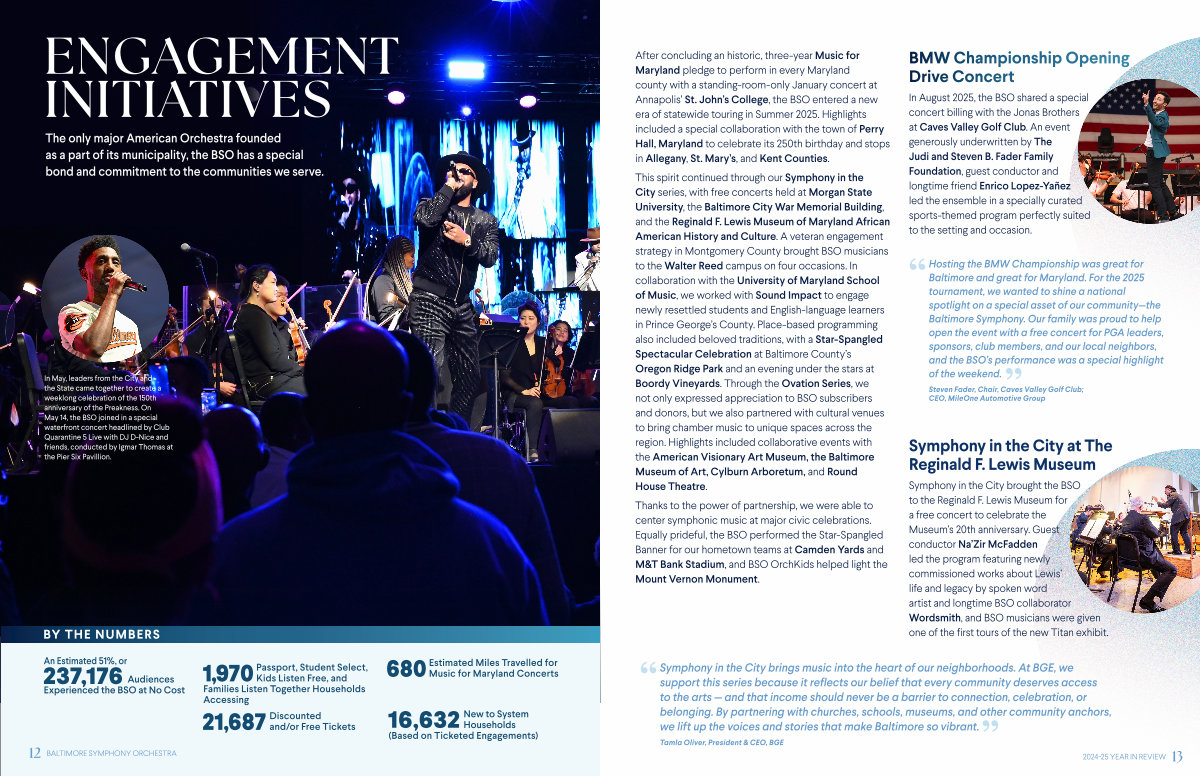 This spirit continued through our Symphony in the City series, with free concerts held at Morgan State University, the Baltimore City War Memorial Building, and the Reginald F. Lewis Museum of Maryland African American History and Culture. A veteran engagement strategy in Montgomery County brought BSO musicians to the Walter Reed campus on four occasions. In collaboration with the University of Maryland School of Music, we worked with Sound Impact to engage newly resettled students and English-language learners in Prince George’ s County. Place-based programming also included beloved traditions, with a Star-Spangled Spectacular Celebration at Baltimore County’ s Oregon Ridge Park and an evening under the stars at Boordy Vineyards. Through the Ovation Series, we not only expressed appreciation to BSO subscribers and donors, but we also partnered with cultural venues to bring chamber music to unique spaces across the region. Highlights included collaborative events with the American Visionary Art Museum, the Baltimore Museum of Art, Cylburn Arboretum, and Round House Theatre.