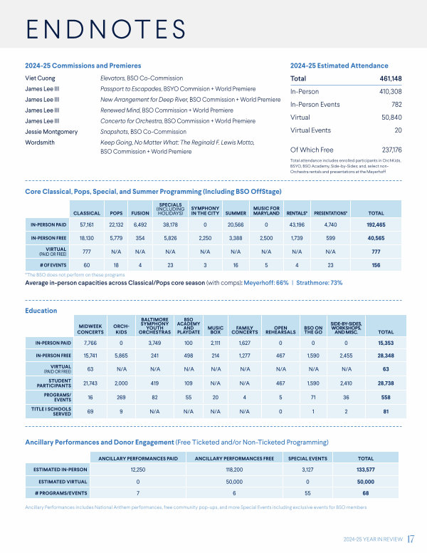 Total attendance includes enrolled participants in OrchKids, BSYO, BSO Academy, Side-by-Sides; and, select non- Orchestra rentals and presentations at the Meyerhoff