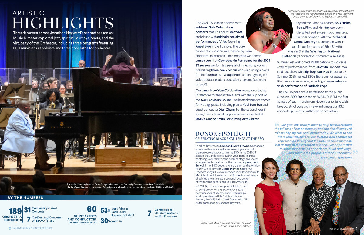 The 2024-25 season opened with sold-out Gala Celebration concerts featuring cellist Yo-Yo Ma and closed with critically acclaimed performances of Aida featuring Angel Blue in the title role. The core subscription season was marked by many additional milestones. The Orchestra welcomed James Lee III as Composer in Residence for the 2024- 25 season, performing several of his existing works, premiering three new commissions( including a piece for the fourth annual GospelFest), and integrating his voice across signature education programs( see more on pg. 8).