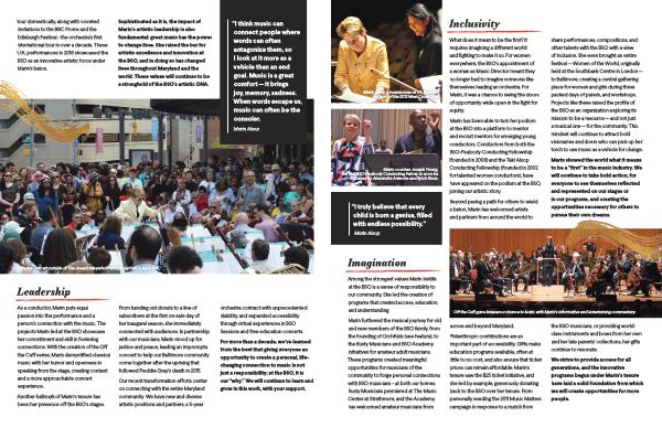little to no cost , and also ensure that ticket We strive to provide access for all prices can remain affordable . Marin ’ s generations , and the innovative tenure saw the $ 25 ticket initiative , and programs begun under Marin ’ s tenure she led by example , generously donating have laid a solid foundation from which back to the BSO over her tenure . From we will create opportunities for more personally seeding the 2011 Music Matters people . campaign in response to a match from