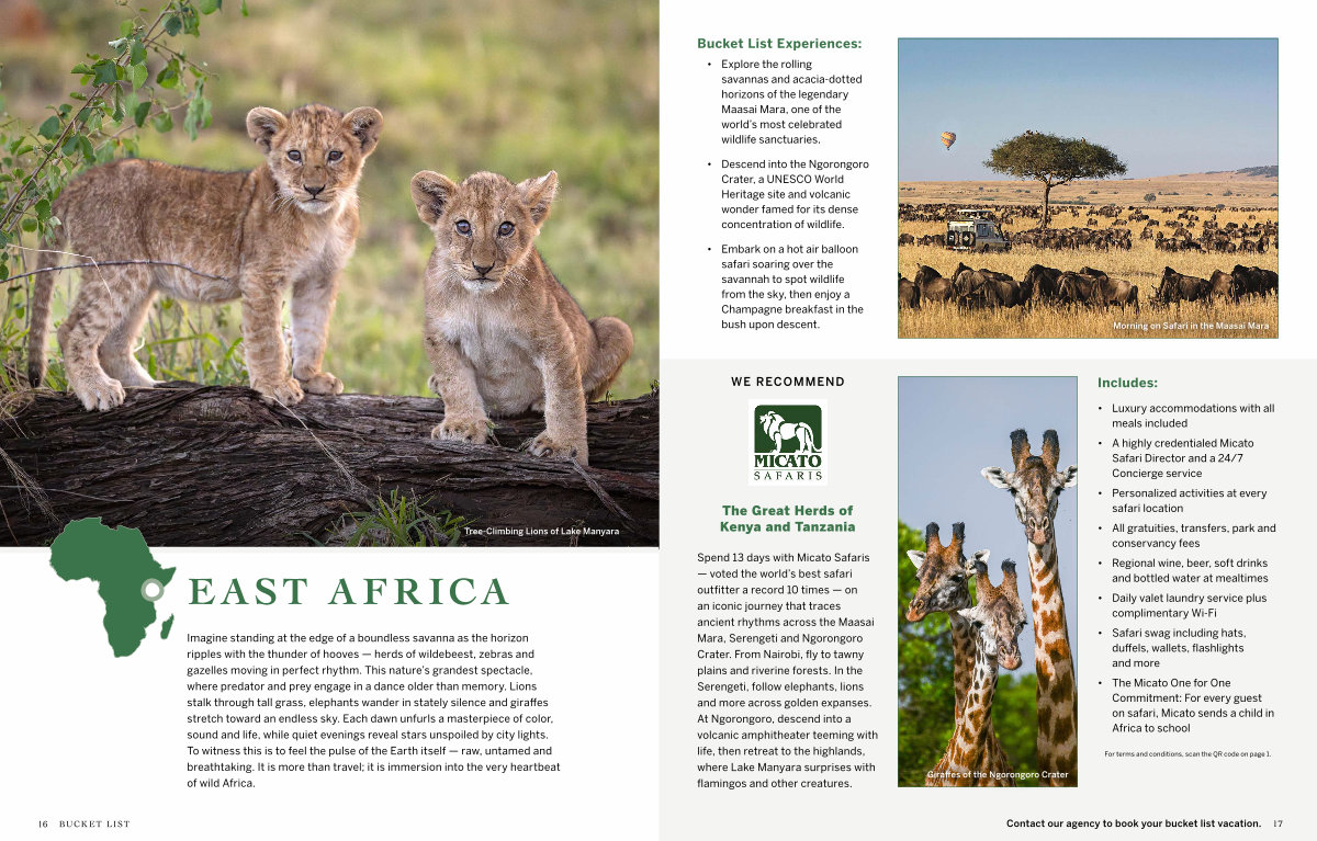 Spend 13 days with Micato Safaris— voted the world’ s best safari outfitter a record 10 times— on an iconic journey that traces ancient rhythms across the Maasai Mara, Serengeti and Ngorongoro Crater. From Nairobi, fly to tawny plains and riverine forests. In the Serengeti, follow elephants, lions and more across golden expanses. At Ngorongoro, descend into a volcanic amphitheater teeming with life, then retreat to the highlands, where Lake Manyara surprises with flamingos and other creatures.