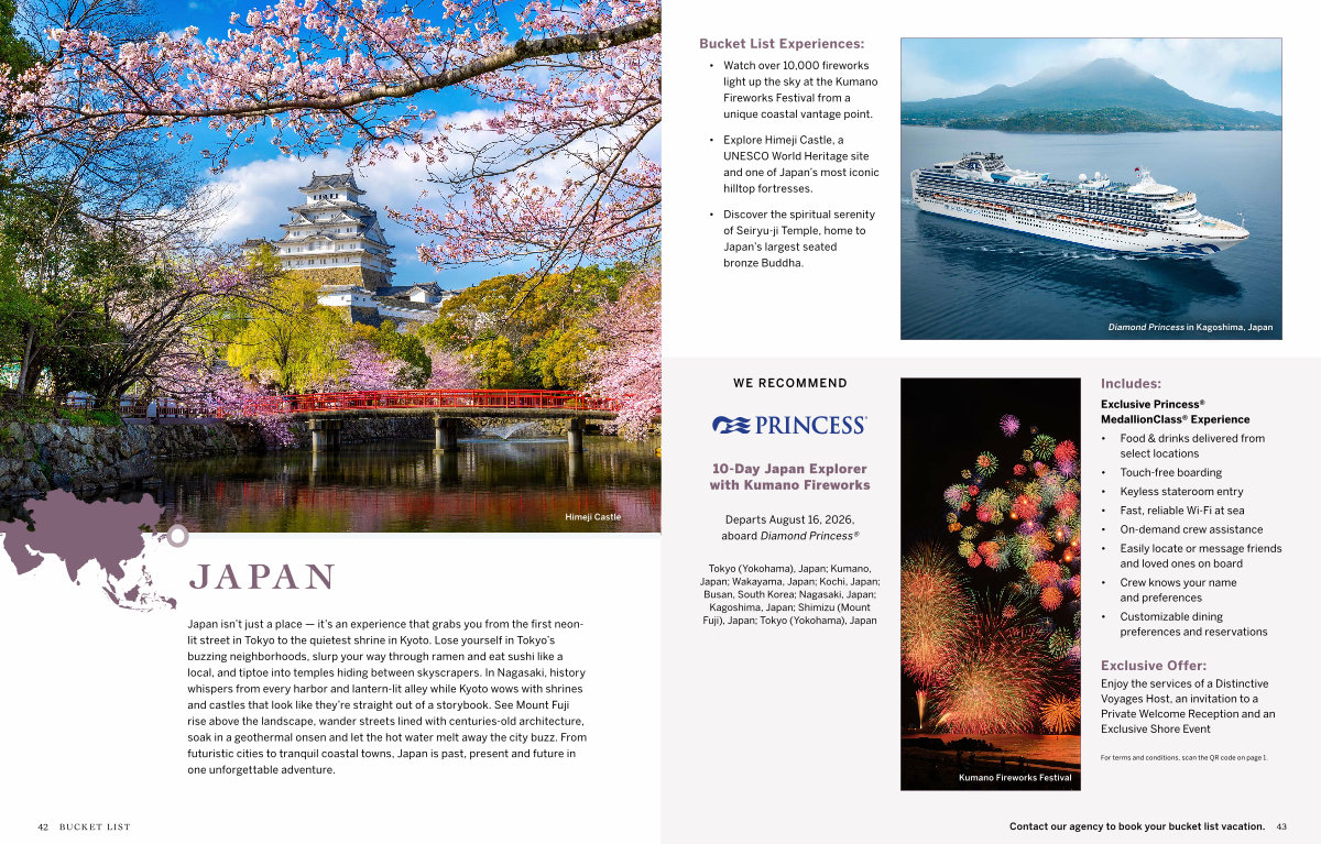 Japan isn’ t just a place— it’ s an experience that grabs you from the first neonlit street in Tokyo to the quietest shrine in Kyoto. Lose yourself in Tokyo’ s buzzing neighborhoods, slurp your way through ramen and eat sushi like a local, and tiptoe into temples hiding between skyscrapers. In Nagasaki, history whispers from every harbor and lantern-lit alley while Kyoto wows with shrines and castles that look like they’ re straight out of a storybook. See Mount Fuji rise above the landscape, wander streets lined with centuries-old architecture, soak in a geothermal onsen and let the hot water melt away the city buzz. From futuristic cities to tranquil coastal towns, Japan is past, present and future in one unforgettable adventure.
