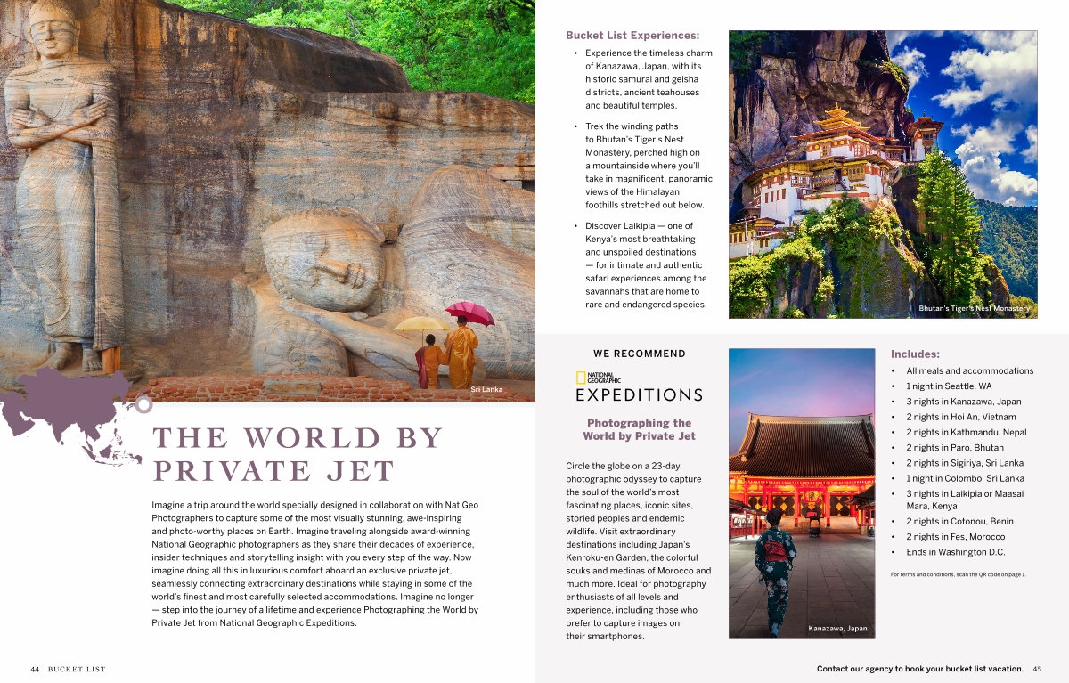 Imagine a trip around the world specially designed in collaboration with Nat Geo Photographers to capture some of the most visually stunning, awe-inspiring and photo-worthy places on Earth. Imagine traveling alongside award-winning National Geographic photographers as they share their decades of experience, insider techniques and storytelling insight with you every step of the way. Now imagine doing all this in luxurious comfort aboard an exclusive private jet, seamlessly connecting extraordinary destinations while staying in some of the world’ s finest and most carefully selected accommodations. Imagine no longer— step into the journey of a lifetime and experience Photographing the World by Private Jet from National Geographic Expeditions.