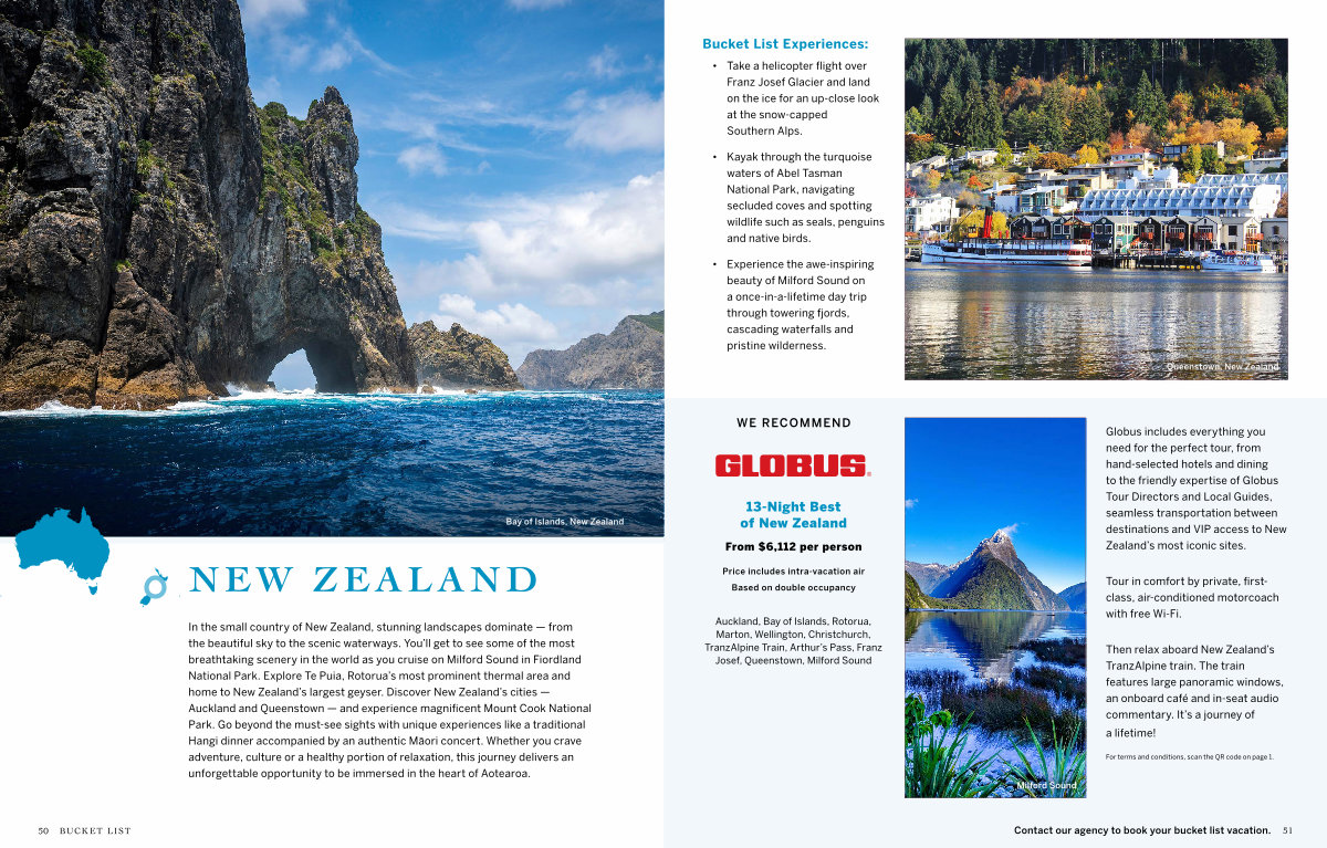 In the small country of New Zealand, stunning landscapes dominate— from the beautiful sky to the scenic waterways. You’ ll get to see some of the most breathtaking scenery in the world as you cruise on Milford Sound in Fiordland National Park. Explore Te Puia, Rotorua’ s most prominent thermal area and home to New Zealand’ s largest geyser. Discover New Zealand’ s cities— Auckland and Queenstown— and experience magnificent Mount Cook National Park. Go beyond the must-see sights with unique experiences like a traditional Hangi dinner accompanied by an authentic Maori concert. Whether you crave adventure, culture or a healthy portion of relaxation, this journey delivers an unforgettable opportunity to be immersed in the heart of Aotearoa.