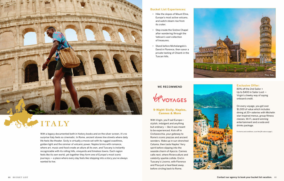 With a legacy documented both in history books and on the silver screen, it’ s no surprise Italy feels so cinematic. In Rome, ancient stones line streets where daily life feels like theater. Sicily is virtually a movie set with its rugged coastlines, golden light and the simmer of volcanic power. Naples brims with romance, where art, music and food create an allure all its own, and Tuscany is instantly recognizable with its rolling hills, vineyards and timeless towns. Each region feels like its own world, yet together they form one of Europe’ s most iconic journeys— a place where every day feels like stepping into a story you’ ve always wanted to live.