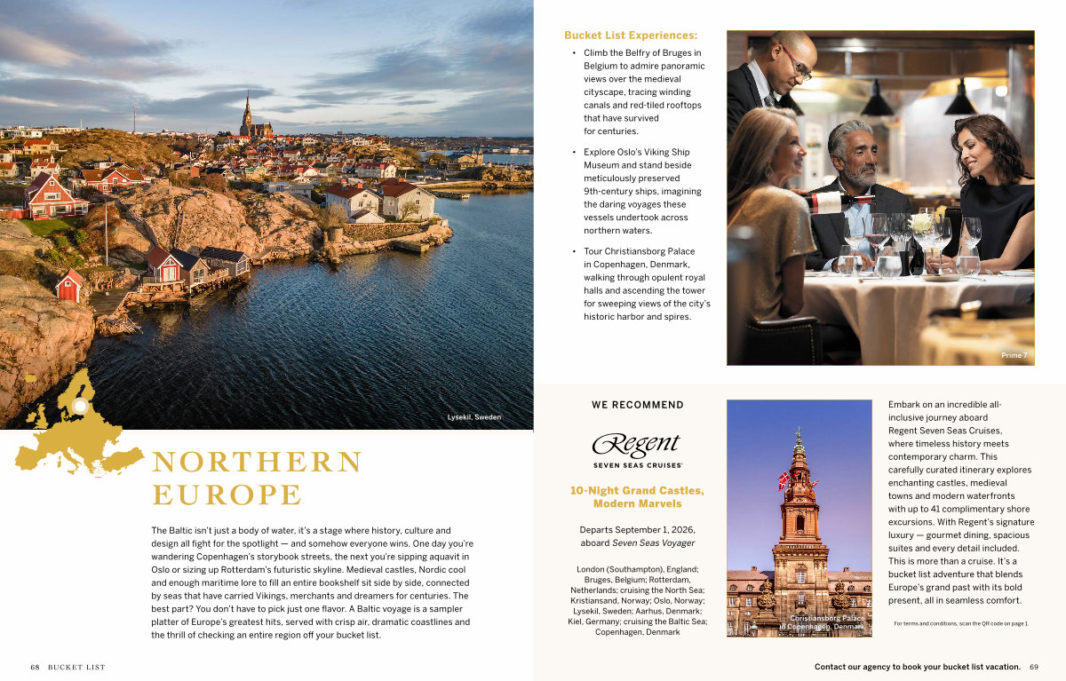 Embark on an incredible allinclusive journey aboard Regent Seven Seas Cruises, where timeless history meets contemporary charm. This carefully curated itinerary explores enchanting castles, medieval towns and modern waterfronts with up to 41 complimentary shore excursions. With Regent’ s signature luxury— gourmet dining, spacious suites and every detail included. This is more than a cruise. It’ s a bucket list adventure that blends Europe’ s grand past with its bold present, all in seamless comfort.