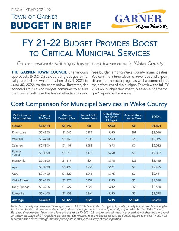 THE GARNER TOWN COUNCIL unanimously approved a $ 43,242,802 operating budget for fiscal year 2021-22 , which runs from July 1 , 2021 to June 30 , 2022 . As the chart below illustrates , the adopted FY 2021-22 budget continues to ensure that Garner will have the lowest effective tax and fees burden among Wake County municipalities . You can find a breakdown of revenues and expenditures on the back page , as well as some of the major features of the budget . To review the full FY 2021-22 budget document , please visit garnernc . gov / departments / finance .