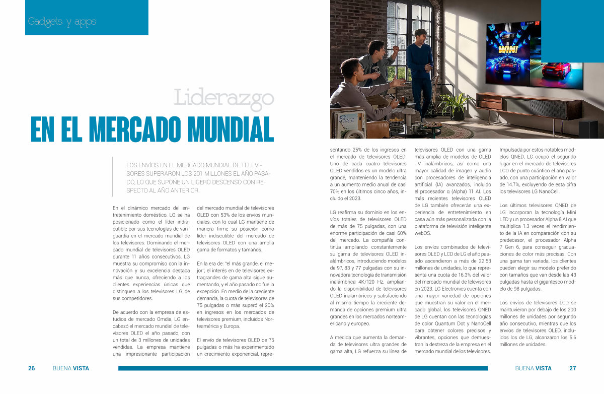 En el dinámico mercado del entretenimiento doméstico , LG se ha posicionado como el líder indiscutible por sus tecnologías de vanguardia en el mercado mundial de los televisores . Dominando el mercado mundial de televisores OLED durante 11 años consecutivos , LG muestra su compromiso con la innovación y su excelencia destaca más que nunca , ofreciendo a los clientes experiencias únicas que distinguen a los televisores LG de sus competidores .