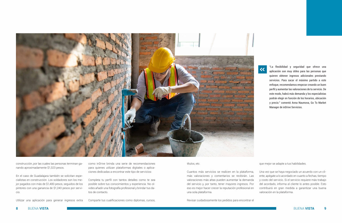 “ La flexibilidad y seguridad que ofrece una aplicación son muy útiles para las personas que quieren obtener ingresos adicionales prestando servicios . Para sacar el máximo partido a este enfoque , recomendamos empezar creando un buen perfil y aumentar las valoraciones de tu servicio . De este modo , habrá más demanda y los especialistas podrán elegir en función de los horarios , ubicación y precio .” comentó Anna Naumova , Go To Market Manager de inDrive Servicios . títulos , etc .