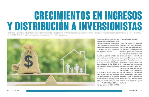 “ Fibra Uno refrenda un trimestre financiero con resultados positivos en sus distintos indicadores . Tenemos el firme propósito de seguir generando dividendos a nuestros inversionistas y de crear valor en las comunidades donde establecemos nuestros inmuebles . Además , hemos capitalizado oportunidades dada la actualidad de fenómenos como el nearshoring . Esta relocalización de las empresas nos ha generado una posibilidad de crecimiento en segmentos como el industrial , para seguir apostando por la competitividad de nuestro país ”, indicó Gonzalo Robina , director general adjunto de FUNO .