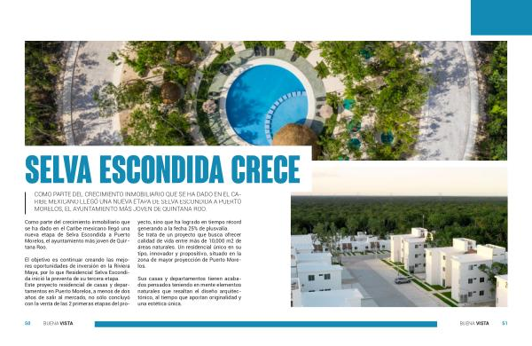 El objetivo es continuar creando las mejores oportunidades de inversión en la Riviera Maya , por lo que Residencial Selva Escondida inició la preventa de su tercera etapa . Este proyecto residencial de casas y departamentos en Puerto Morelos , a menos de dos años de salir al mercado , no sólo concluyó con la venta de las 2 primeras etapas del proyecto , sino que ha logrado en tiempo récord generando a la fecha 25 % de plusvalía . Se trata de un proyecto que busca ofrecer calidad de vida entre más de 10,000 m2 de áreas naturales . Un residencial único en su tipo , innovador y propositivo , situado en la zona de mayor proyección de Puerto Morelos .