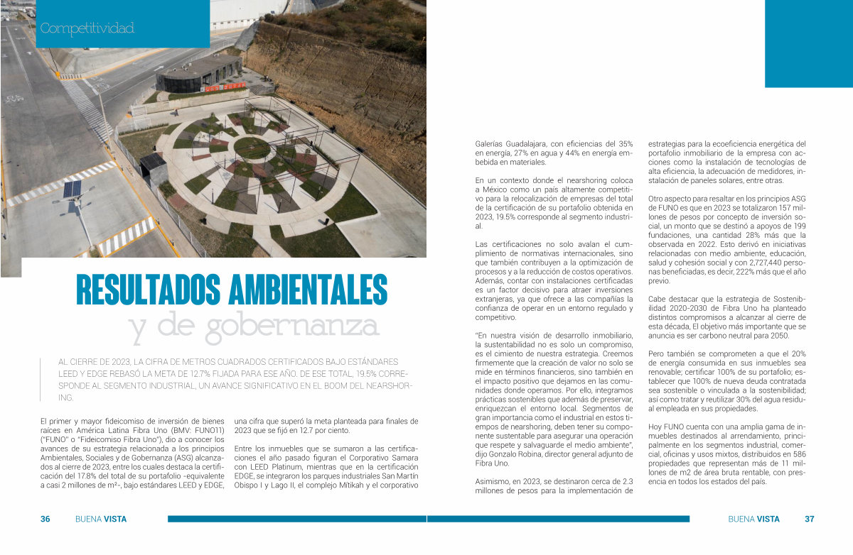 “ En nuestra visión de desarrollo inmobiliario , la sustentabilidad no es solo un compromiso , es el cimiento de nuestra estrategia . Creemos ���������������������������������������������� ��������������������������������������������� el impacto positivo que dejamos en las comunidades donde operamos . Por ello , integramos prácticas sostenibles que además de preservar , enriquezcan el entorno local . Segmentos de gran importancia como el industrial en estos tiempos de nearshoring , deben tener su componente sustentable para asegurar una operación que respete y salvaguarde el medio ambiente ”, dijo Gonzalo Robina , director general adjunto de Fibra Uno .