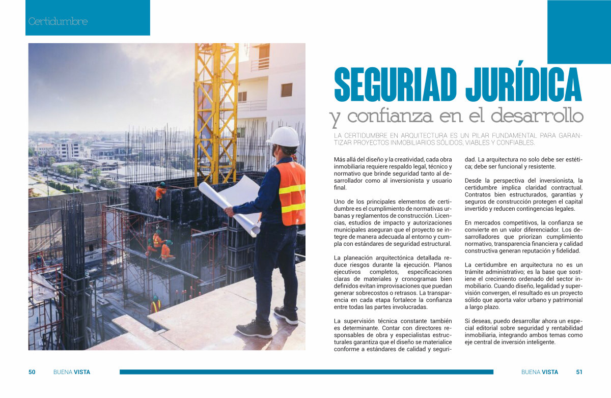 Desde la perspectiva del inversionista, la certidumbre implica claridad contractual. Contratos bien estructurados, garantías y seguros de construcción protegen el capital invertido y reducen contingencias legales.