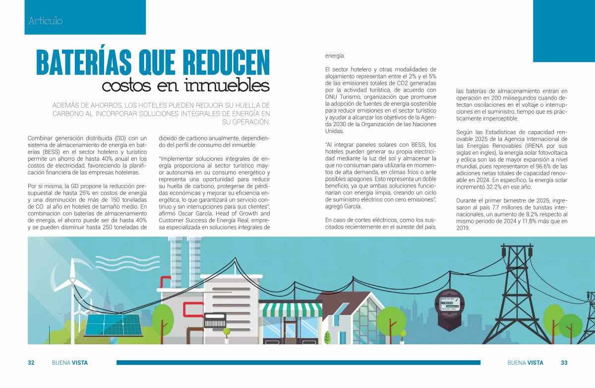 “ Al integrar paneles solares con BESS, los hoteles pueden generar su propia electricidad mediante la luz del sol y almacenar la que no consuman para utilizarla en momentos de alta demanda, en climas fríos o ante posibles apagones. Esto representa un doble beneficio, ya que ambas soluciones funcionarían con energía limpia, creando un ciclo de suministro eléctrico con cero emisiones”, agregó García.