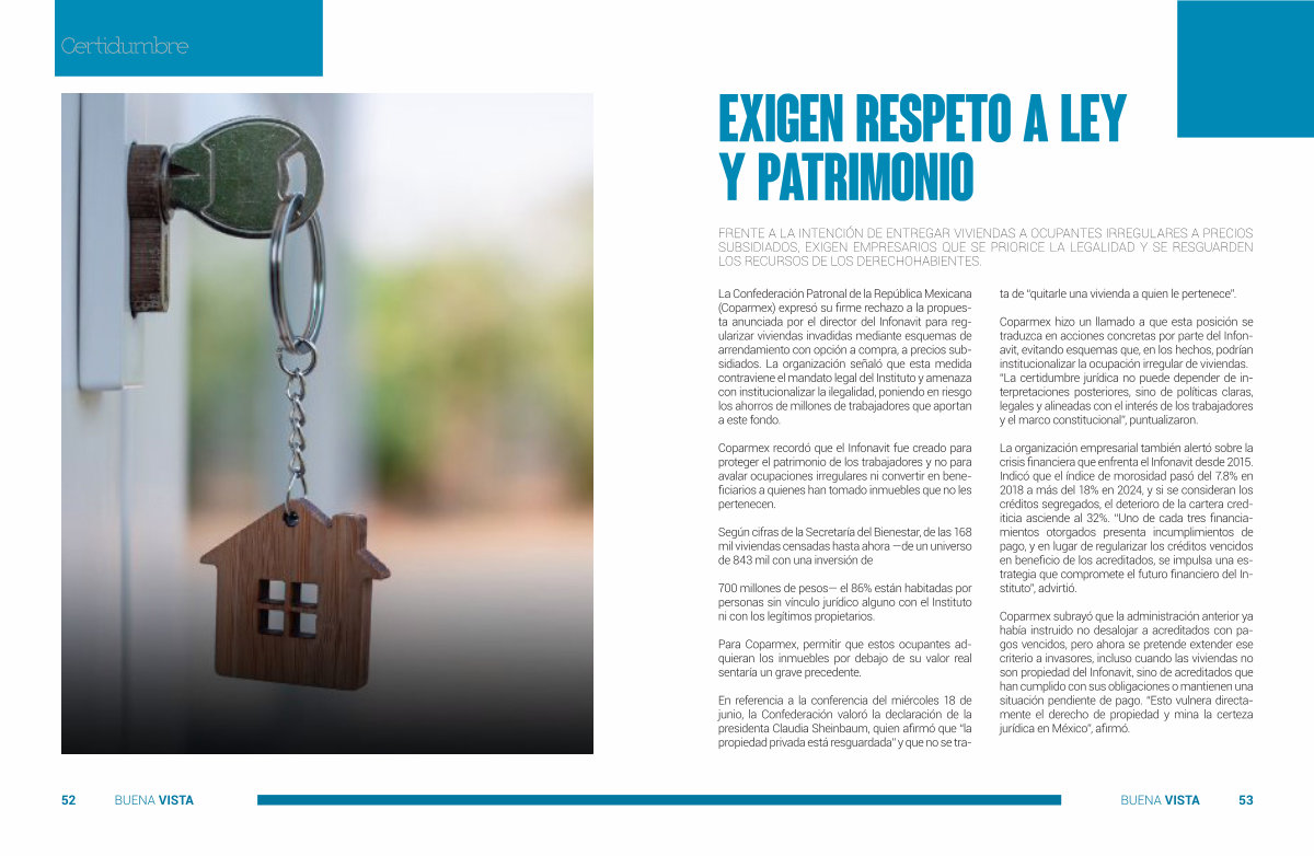 Coparmex subrayó que la administración anterior ya había instruido no desalojar a acreditados con pagos vencidos, pero ahora se pretende extender ese criterio a invasores, incluso cuando las viviendas no son propiedad del Infonavit, sino de acreditados que han cumplido con sus obligaciones o mantienen una situación pendiente de pago.“ Esto vulnera directamente el derecho de propiedad y mina la certeza jurídica en México”, afirmó.