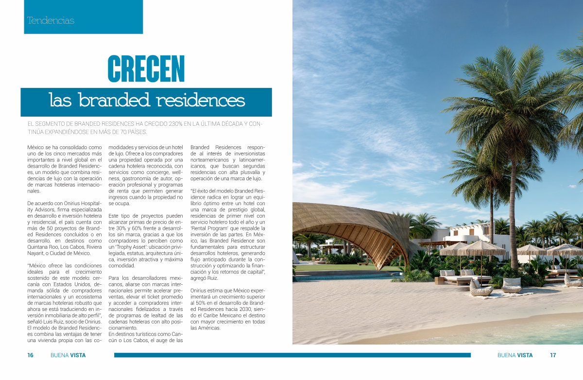 De acuerdo con Onirius Hospitality Advisors, firma especializada en desarrollo e inversión hotelera y residencial, el país cuenta con más de 50 proyectos de Branded Residences concluidos o en desarrollo, en destinos como Quintana Roo, Los Cabos, Riviera Nayarit, o Ciudad de México.