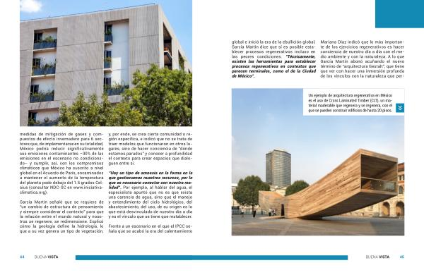Un ejemplo de arquitectura regenerativa en México es el uso de Cross Laminated Timber ( CLT ), un material maderable que regenera y se regenera , con el que se pueden construir edificios de hasta 20 pisos .