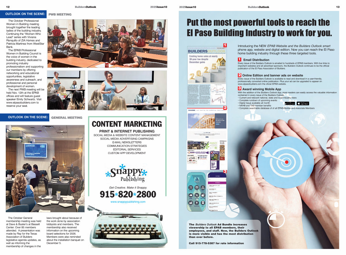 Every issue of the Builders Outlook is available to read and download in a user-friendly, professionally converted online publication. Plus your ad can be upgraded to appear on www. elpasobuilders. com the oficial EPAB website.