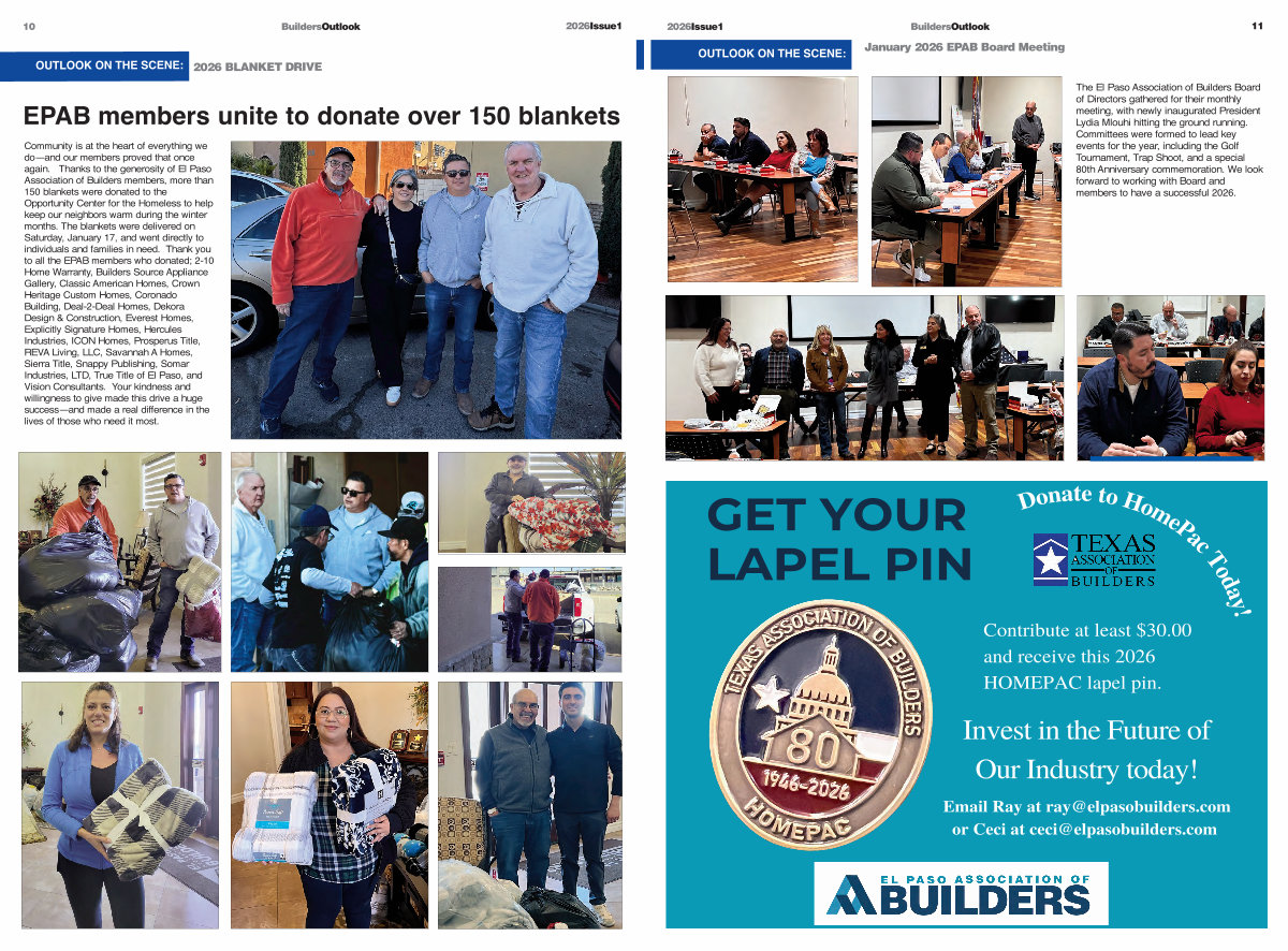 Community is at the heart of everything we do— and our members proved that once again. Thanks to the generosity of El Paso Association of Builders members, more than 150 blankets were donated to the Opportunity Center for the Homeless to help keep our neighbors warm during the winter months. The blankets were delivered on Saturday, January 17, and went directly to individuals and families in need. Thank you to all the EPAB members who donated; 2-10 Home Warranty, Builders Source Appliance Gallery, Classic American Homes, Crown Heritage Custom Homes, Coronado Building, Deal-2-Deal Homes, Dekora Design & Construction, Everest Homes, Explicitly Signature Homes, Hercules Industries, ICON Homes, Prosperus Title, REVA Living, LLC, Savannah A Homes, Sierra Title, Snappy Publishing, Somar Industries, LTD, True Title of El Paso, and Vision Consultants. Your kindness and willingness to give made this drive a huge success— and made a real difference in the lives of those who need it most.