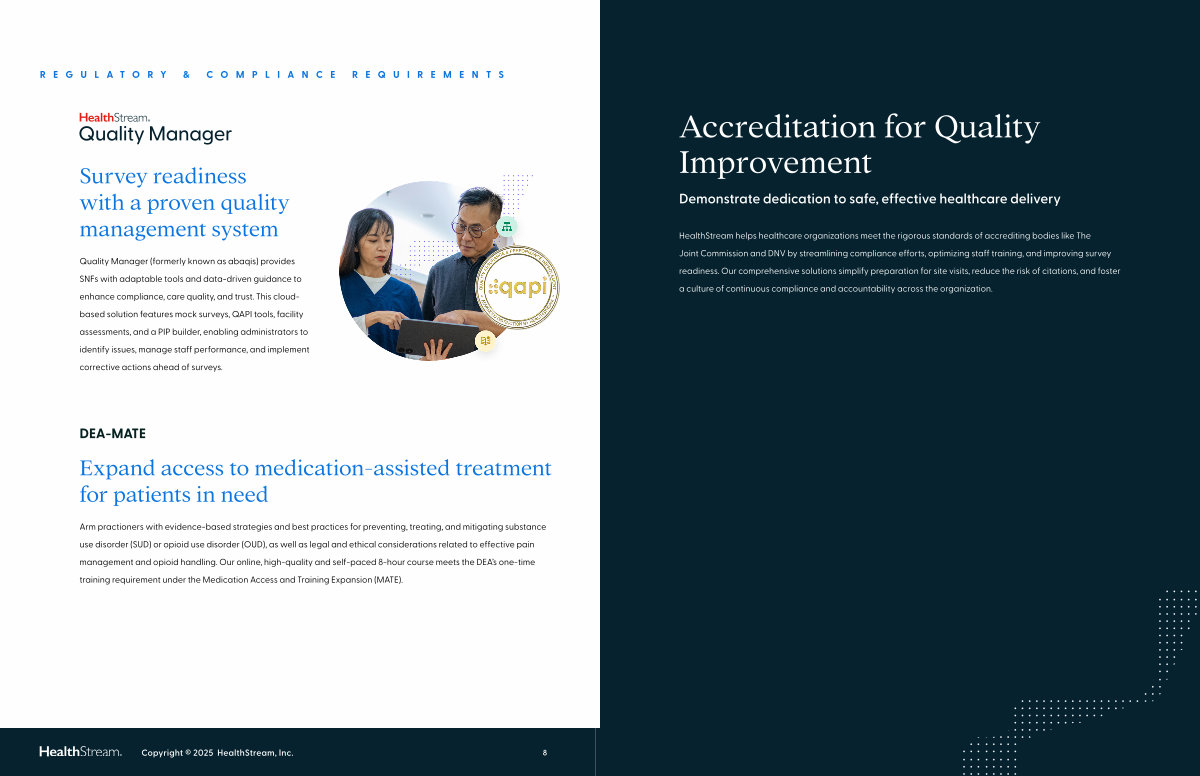 HealthStream helps healthcare organizations meet the rigorous standards of accrediting bodies like The Joint Commission and DNV by streamlining compliance efforts, optimizing staff training, and improving survey readiness. Our comprehensive solutions simplify preparation for site visits, reduce the risk of citations, and foster a culture of continuous compliance and accountability across the organization.