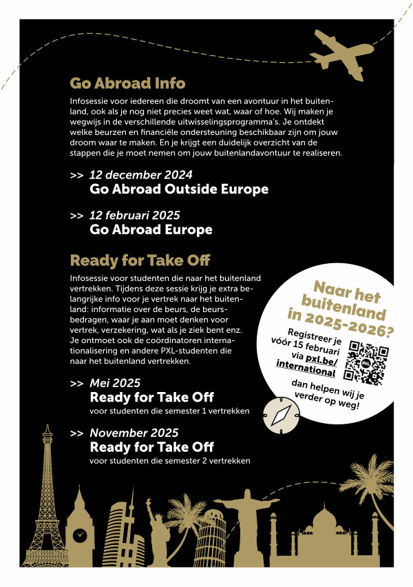 Infosessie voor studenten die naar het buitenland vertrekken. Tijdens deze sessie krijg je extra belangrijke info voor je vertrek naar het buitenland: informatie over de beurs, de beursbedragen, waar je aan moet denken voor vertrek, verzekering, wat als je ziek bent enz. Je ontmoet ook de coördinatoren internationalisering en andere PXL-studenten die naar het buitenland vertrekken.